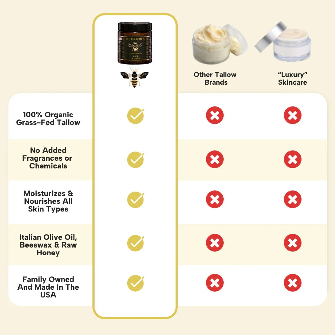Unlike traditional moisturizers that may contain synthetic ingredients and additives, ourtallow balms are crafted with pure, natural ingredients. Tallow closely resembles thestructure of human skin lipids alowina for better absorption and hydration.